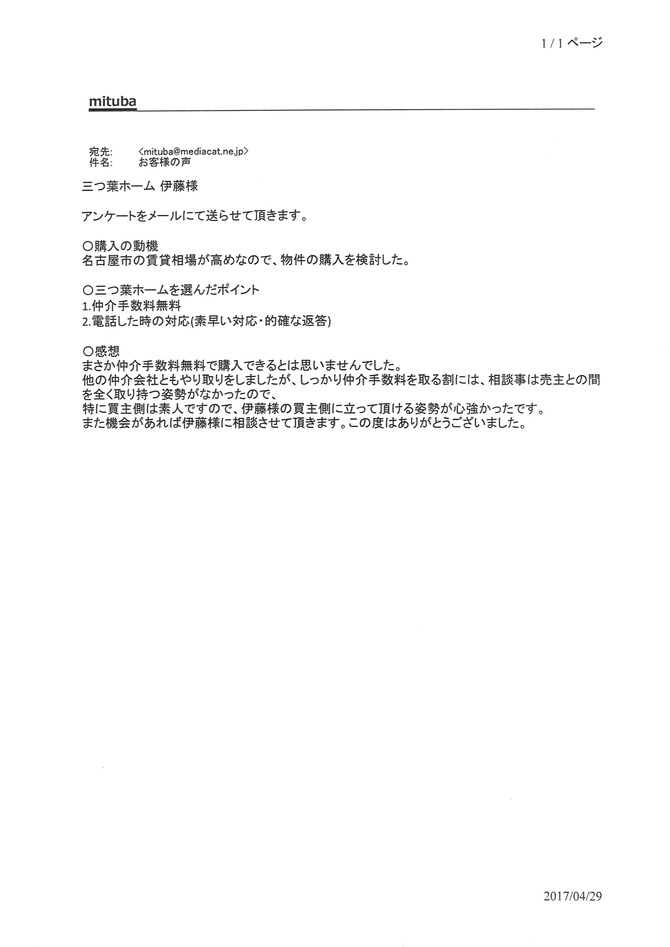 新築一戸建てを買うなら仲介手数料無料の愛知県の三つ葉ホーム。当社購入したお客様の声です。