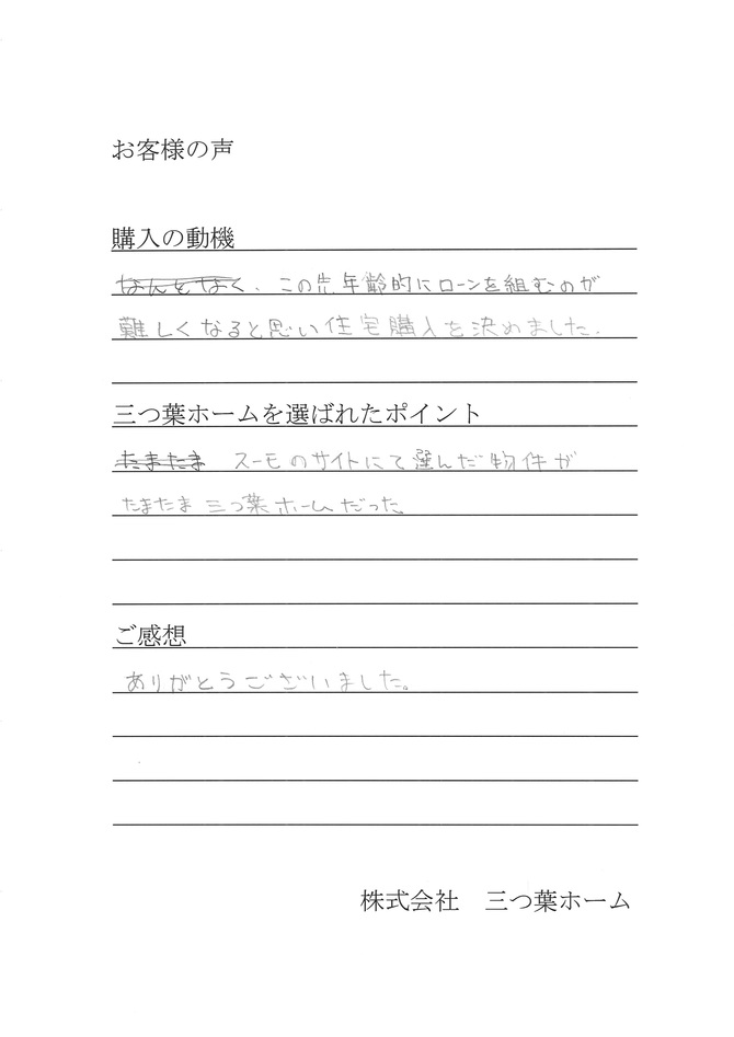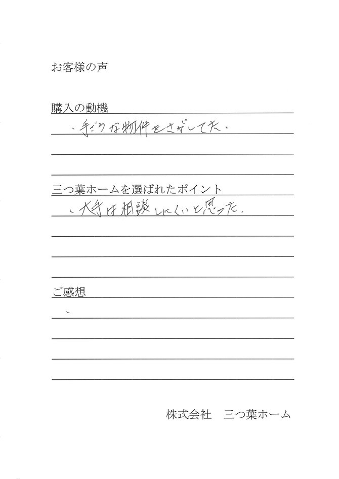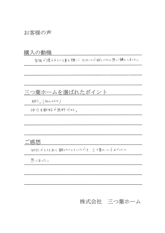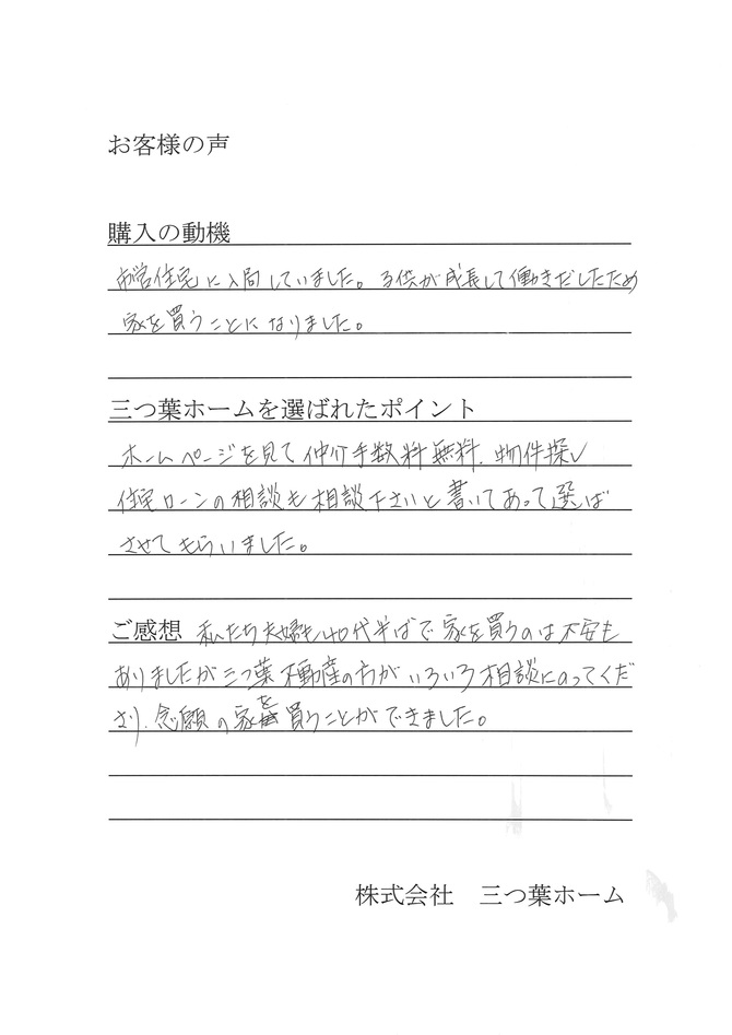 たまたま友人と家の話をしていた所知り合いに不動産関係の仕事をしている人がいるとの事でしたので一度相談にのってもらいたいとお願いしたところ後日来て頂いたのが三つ葉ホームさんでした。最初は資金計画の話をいろいろ教えて頂き本当に購入できる物件の価格が把握できたので希望エリア内で見学に行くことにしました。たまたま見た数件の中で買いたいと思える物件があったのですが金額が予定より高く無理だと思っていましたが、物件価格の交渉と仲介手数料が0円だった事でトータル的に買える価格になり購入を決めました。住宅ローンの金利も低く当初考えていた月々の支払額より安い支払額で購入する事が出来とても良かったと思います。