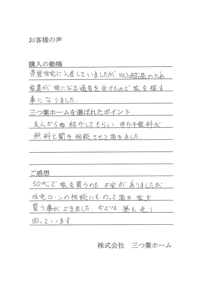家族3人で公営住宅に住んでいました。娘が就職したことにより家賃が倍になり支払いが困難になるので今までと同じ家賃で借りられる家を探しました。しかしどこも同じ家賃だと部屋数が少なく住み替えられる物件はありませんでした。賃貸住宅では該当物件はありませんでしたが家の近くに家賃と同じ支払いで買えるリフォーム済中古戸建がありました。月々の支払は変わらず部屋数は増えピッタリの物件でした。私はパート勤めで年収も少なく住宅ローンは借りられない状態でしたが就職した娘は正社員でしたので何とか借りられないものかとインターネットで探していたところ三つ葉ホームさんを見つけ資料の問い合わせをしました。住宅を購入するのに別途諸経費が掛かることも知らず引っ越し費用も用意できない状態でしたが諸費用は住宅ローンで用意ができ引越し費用は三つ葉ホームさんの30万円プレゼントで何とかすることができました。自己資金は全然ありませんでしたが私が探している条件で住宅が購入でき引っ越し費用も用意ができ本当に良かったと思います。